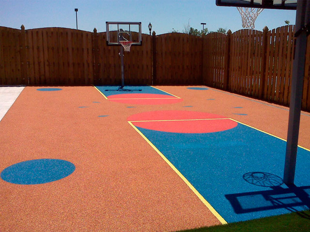 Спортивное резиновое покрытие применяется для открытых уличных площадок: мини футбол, баскетбол, теннис, бадминтон, хоккей, беговые дорожки и т.д.. Спортивная разметка производится специальной резиновой краской разного цвета. Устройство, монтаж и укладка крошки бесшовным методом непосредственно на месте, на улице. Основание для покрытия должно быть твёрдое: асфальт или бетон. Срок укладки уличных напольных покрытий зависит от многих факторов и в среднем составляет 500-2000 кв.м. в день на бригаду. Использовать покрытие можно уже через 24 часа. Мы работаем с любыми объемами, по Москве и области, без выходных и праздников.