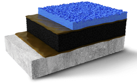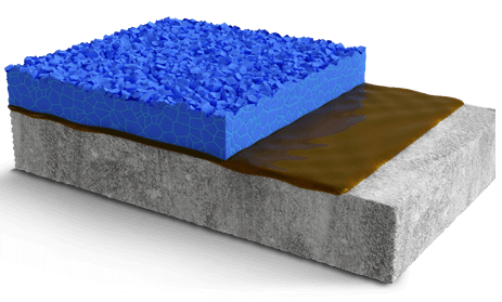 При укладке бесшовного покрытия, первым слоем является черновой слой из резиновой крошки служащим подложкой. Для увеличения упругости покрытия может применяться резиновая крошка более мелкой фракции (0,5-2,5 мм).