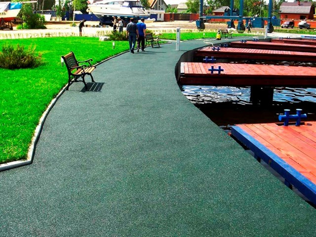 Резиновое покрытие можно укладывать на щебеночное основание, отсев, асфальт, бетон, тротуарную и керамогранитную плитку, металлические листы.